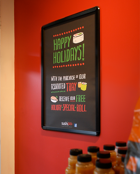 SushiGo is a Sushi restaurant and delivery service with diverse branches in Ottawa/Gatineau. I was assigned to develop posters, window graphics and other promotional tools for their winter campaign.